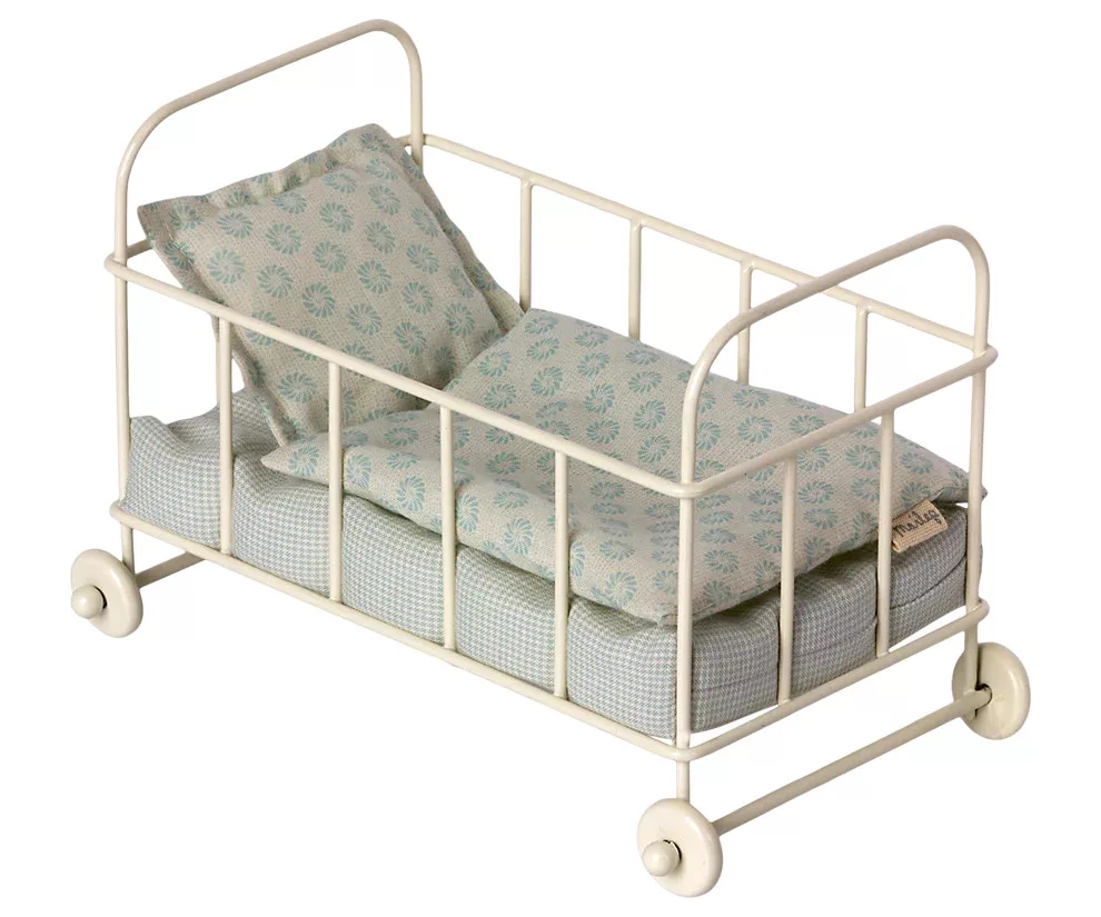 Hangulatos, fémből készült kiságy, matraccal, takaróval és párnával. Beillesztheti mikro méretű barátait és a kis egereket is.