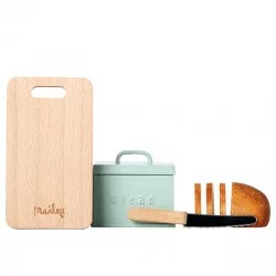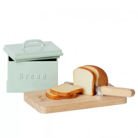 Ez a miniatűr játékkészlet egy kenyérdobozból, félkenyérből és 3 szeletből, egy vágódeszkából és egy késből áll. Tökéletes kezdete egy játéknak a miniatűr konyhában.