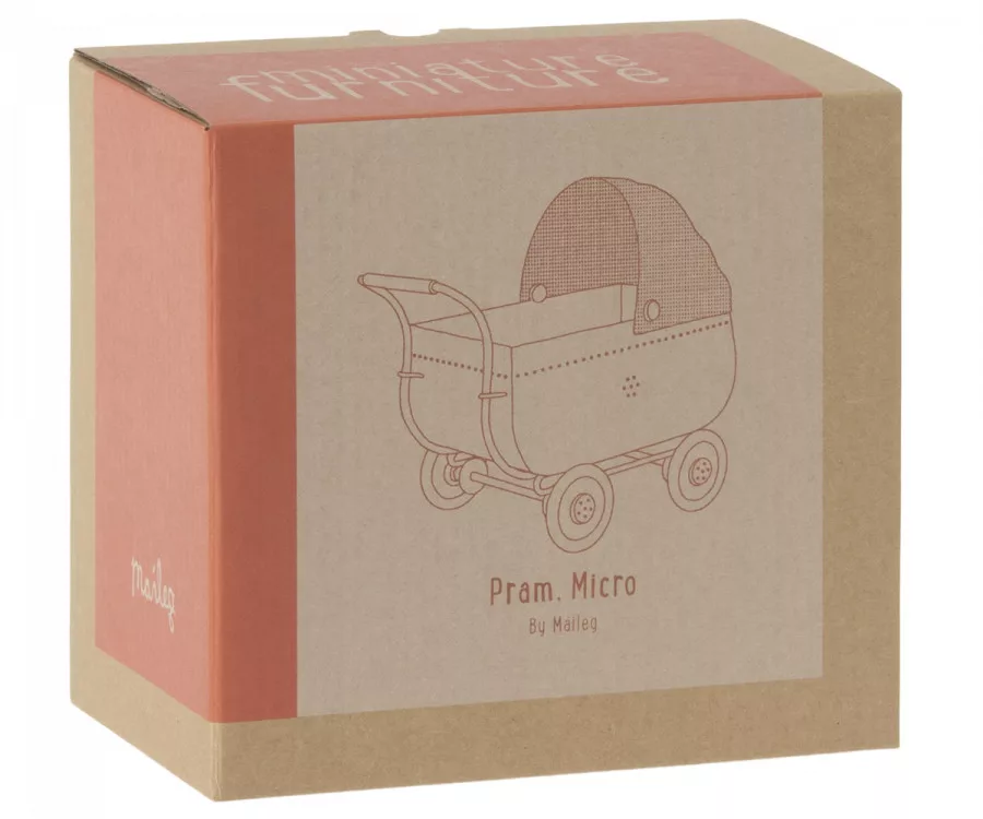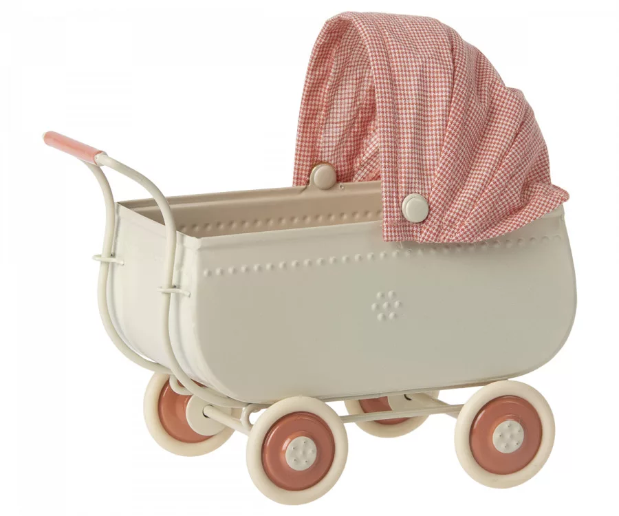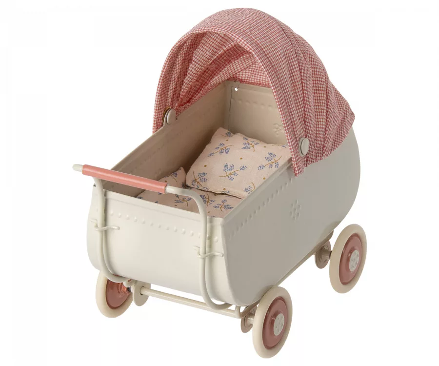 Egy gyönyörű Maileg babakocsi exkluzív vintage megjelenéssel. A fém rész oldalán dombornyomott részletek találhatók, a szövet huzat pedig kiteljesíti a megjelenést. A babakocsi tökéletes sétához, amikor a baba alszik.