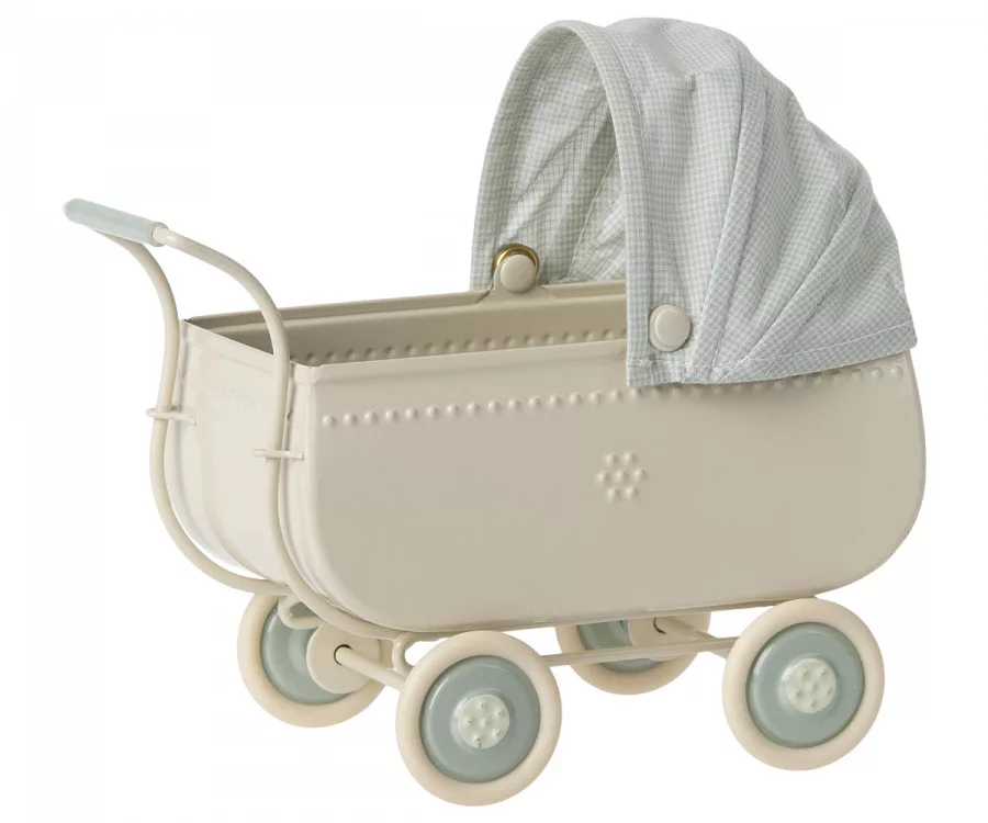 Egy gyönyörű Maileg babakocsi exkluzív vintage megjelenéssel. A fém rész oldalán dombornyomott részletek találhatók, a szövet huzat pedig kiteljesíti a megjelenést. A babakocsi tökéletes sétához, amikor a baba alszik.