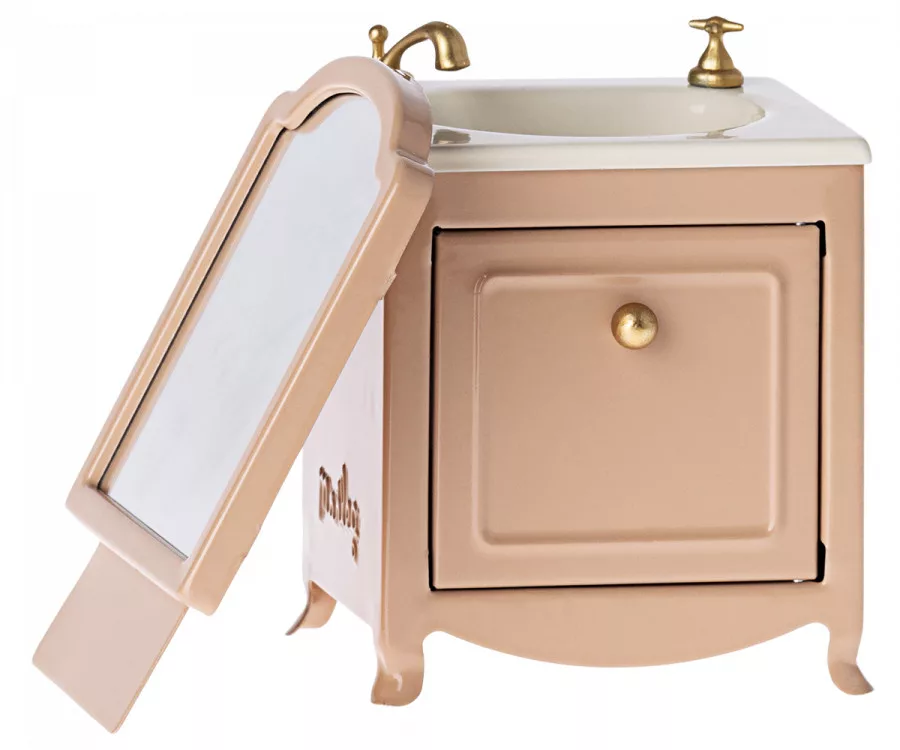 Ez a fürdőszobai mosdószekrény gyönyörű darab minden babaház fürdőszobájába. A mosogató alatt van egy kis szekrény és persze tükör is.