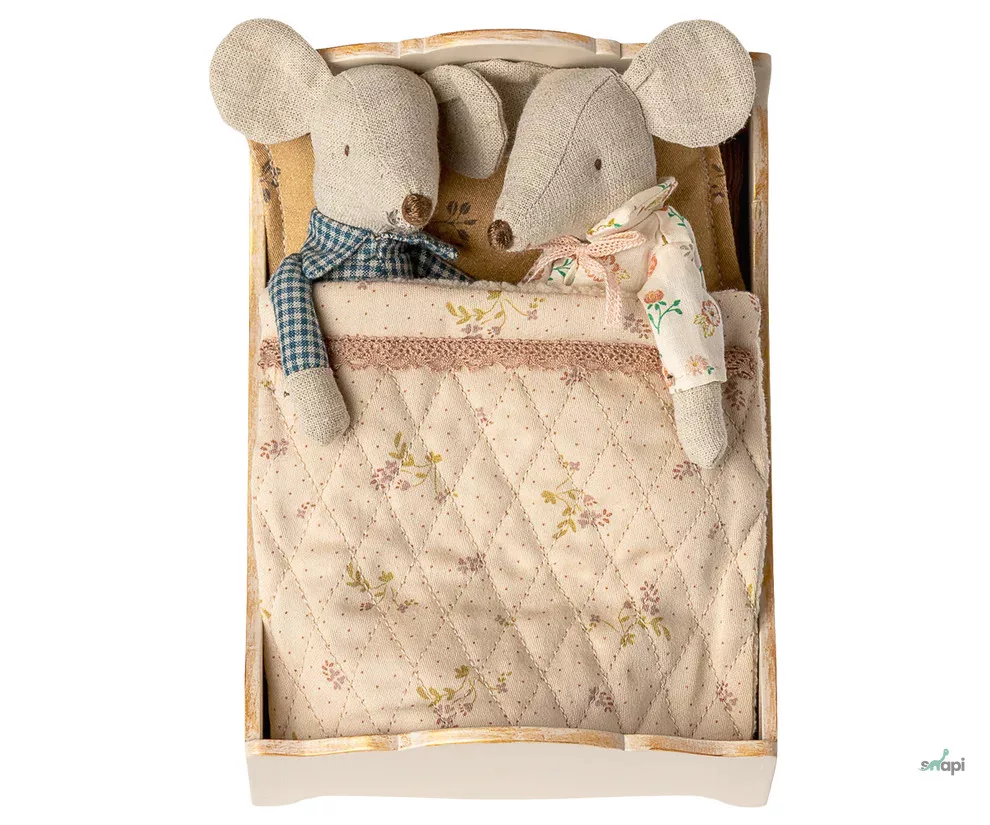 Tökéletes ágy a pihentető éjszakai alváshoz. Gyönyörű apró részletekkel rendelkezik, mint például az aranyozott fafelület és a gyönyörűen összeválogatott ágyneműhuzat. Két egér is könnyen elfér egymás mellett, mivel két egeret is el lehet helyezni benne.