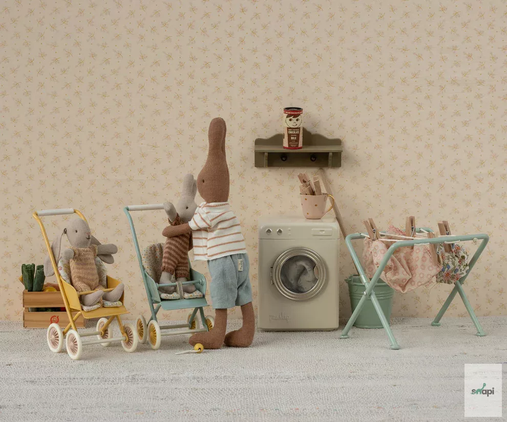 A babakocsi tökéletes kis nyuszi/nyúl méretű babáknak. A kocsi nagyszerű segítség a szerető nyuszi családnak, így magukkal vihetik a babáikat a parkba és a városba tett kirándulásokra.
