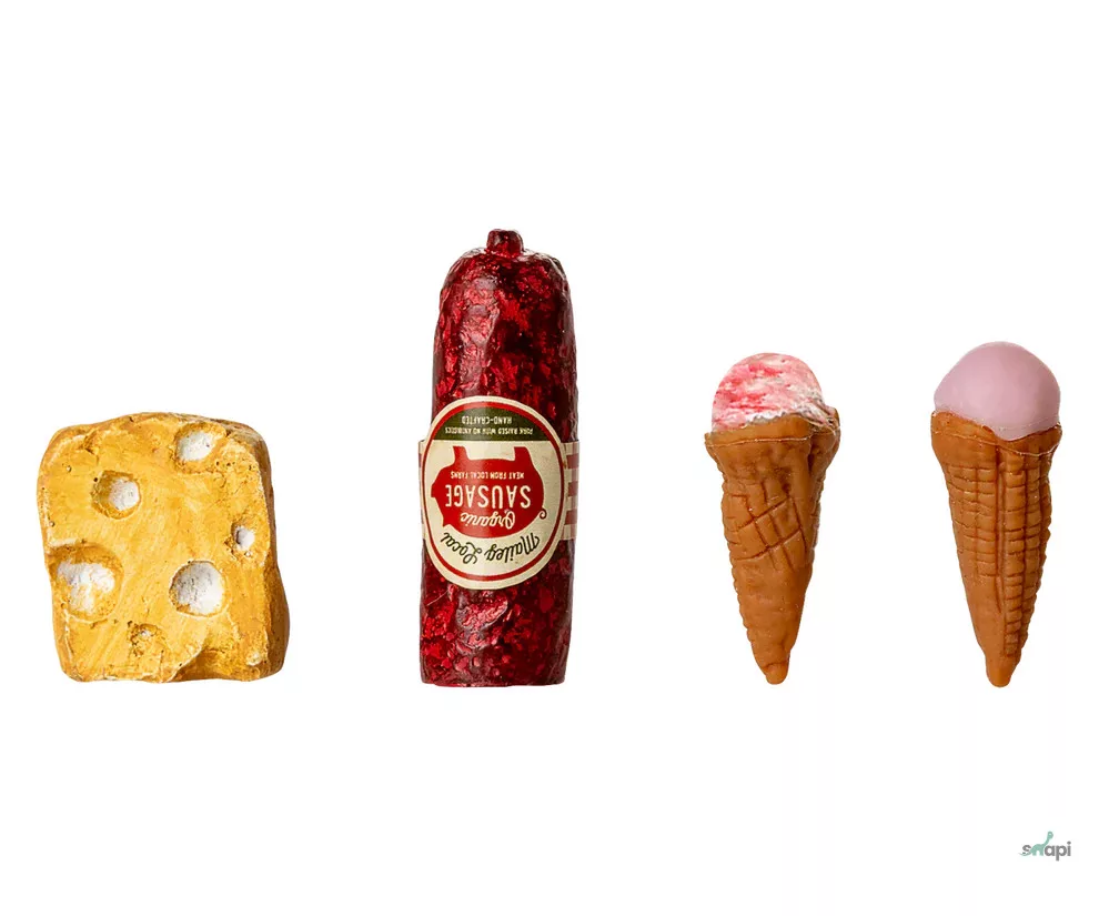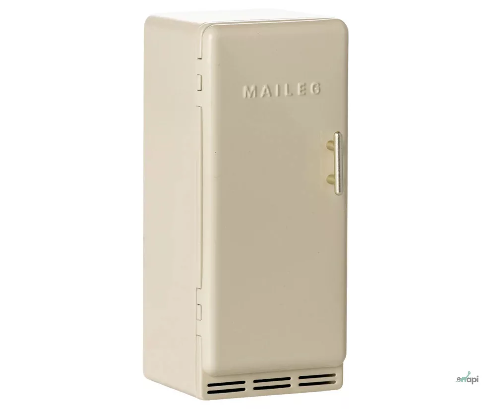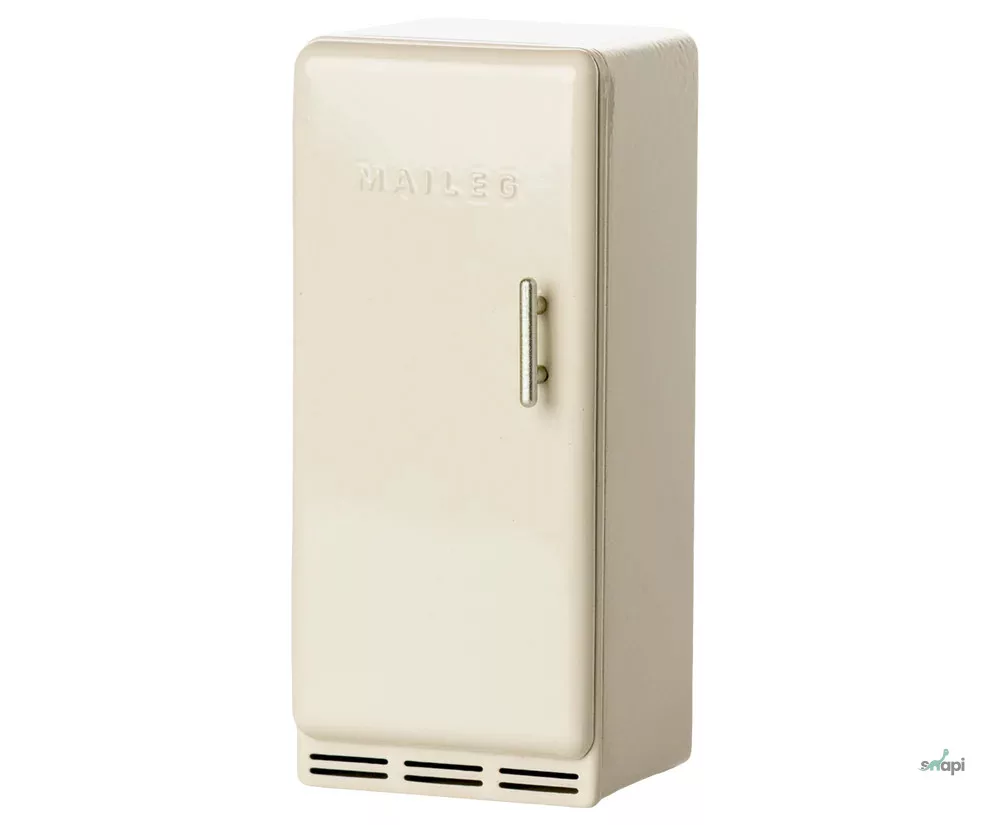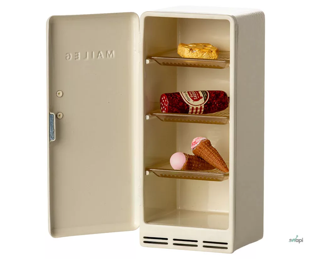 Egy régimódi hűtőszekrény, ami tökéletesen illik a Maileg Egérlyuk Farmházba. A hűtőben egy kis sajt, kolbász és néhány fagylalt található. Ezek meghosszabbítják a történetmesélést és a játékot.