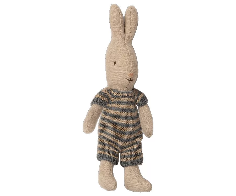 Ez az édes, mikroméretű nyuszi puha len/pamut keverékből kötött csíkos overált visel. Minden mikroméretű bútorhoz illeszkedik, és sok órányi játékot biztosít. A kötött overál 3 szép színkombinációban kapható. Méretében remekül passzol az egerekhez  vagy lehetnek a nagyobb méretű nyuszik babanyuszikái is.
