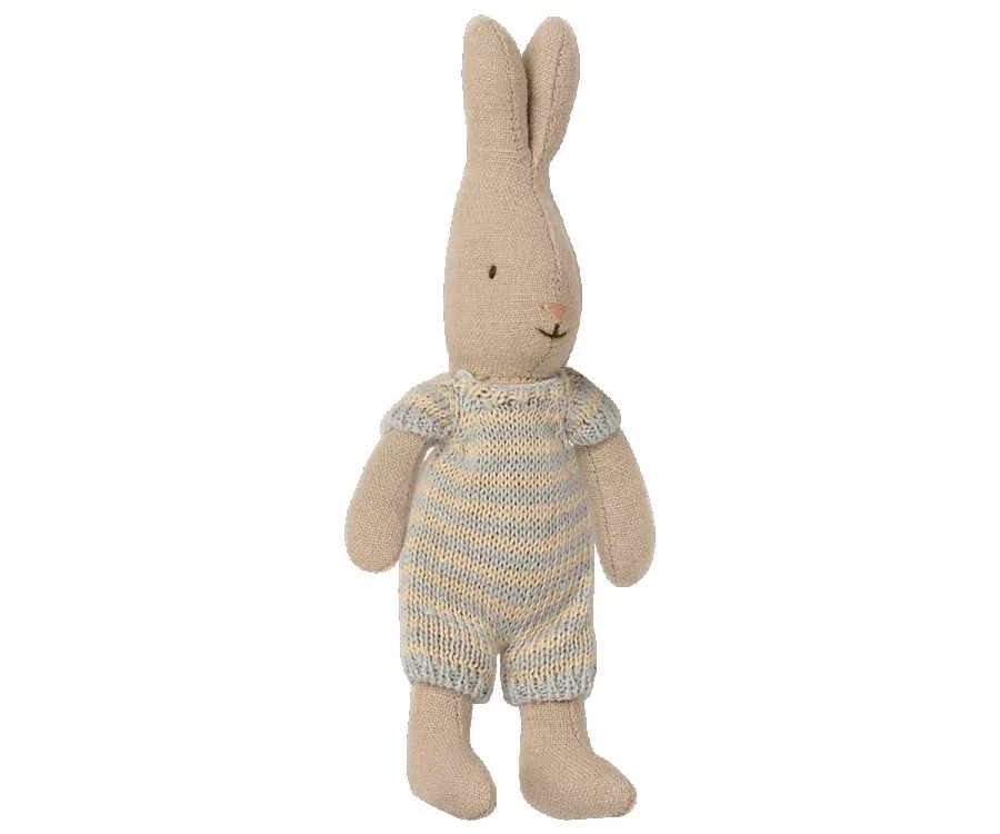 Ez az édes, mikroméretű nyuszi puha len/pamut keverékből kötött csíkos overált visel. Minden mikroméretű bútorhoz illeszkedik, és sok órányi játékot biztosít. A kötött overál 3 szép színkombinációban kapható. Méretében remekül passzol az egerekhez  vagy lehetnek a nagyobb méretű nyuszik babanyuszikái is.