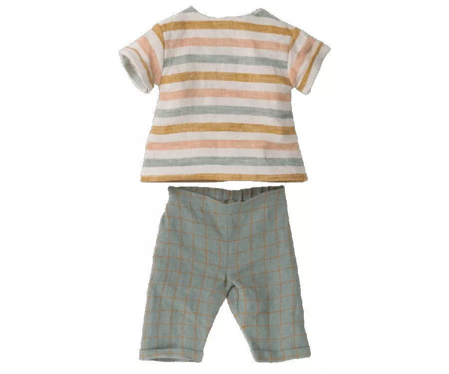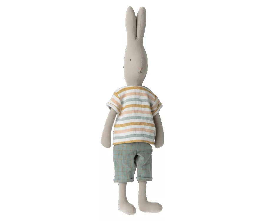 A nyuszi és nyúl kollekció puha, természetes vászon és pamut anyagból készült - ami kellemes kézérzetet és megjelenést kölcsönöz. Ez a nyúl gyönyörű nadrágot és inget visel.