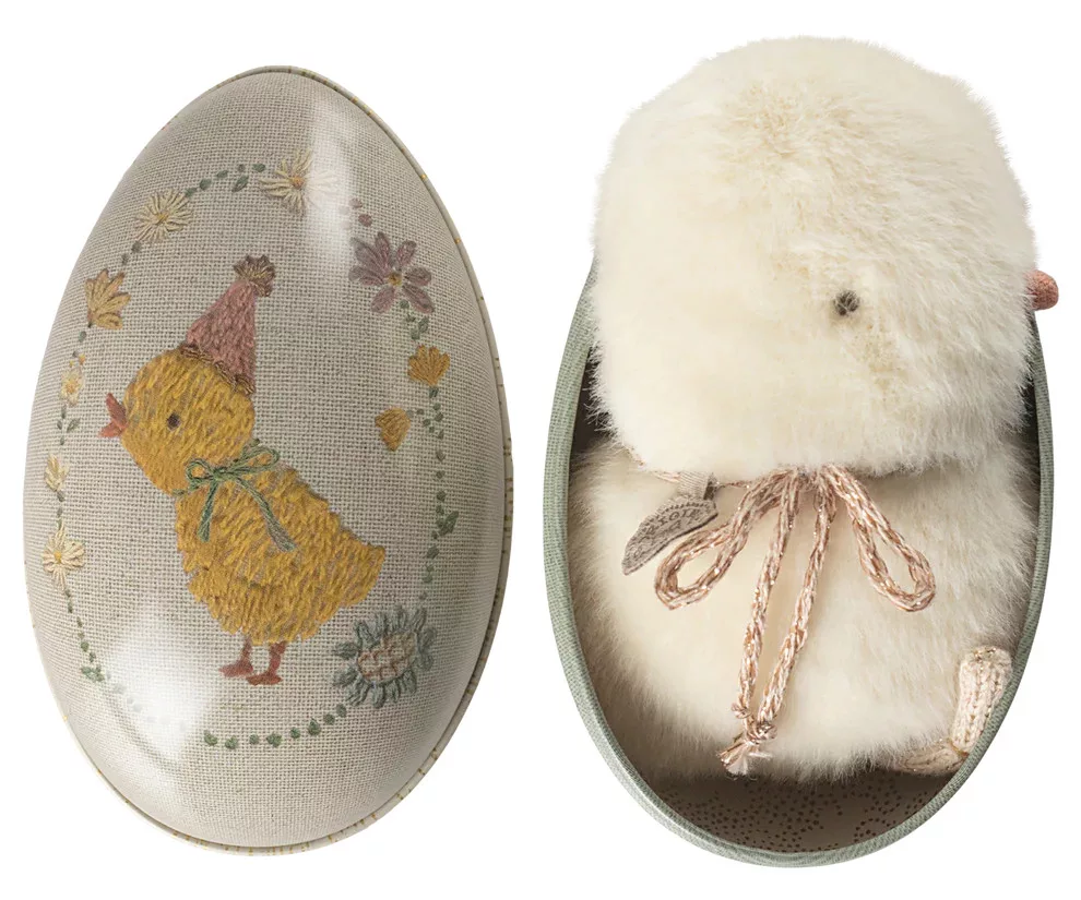Kis plüssjáték, amely tökéletes egy apró kézhez. Ez a csirke a legédesebb megjelenésű és nagyon puha kézérzettel rendelkezik. A kis lábak arany hatású kötött madzagból készültek. A fémtojást külön kell megvásárolni hozzá, ITT