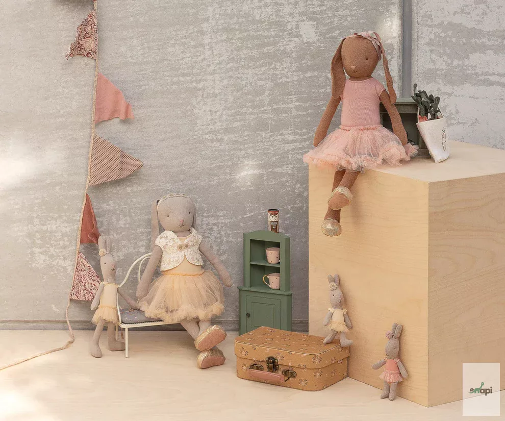 A jól ismert Maileg nyuszi balett-táncosnak öltözött. Rózsaszín kosztümöt, tüll szoknyát és balettcipőket visel.