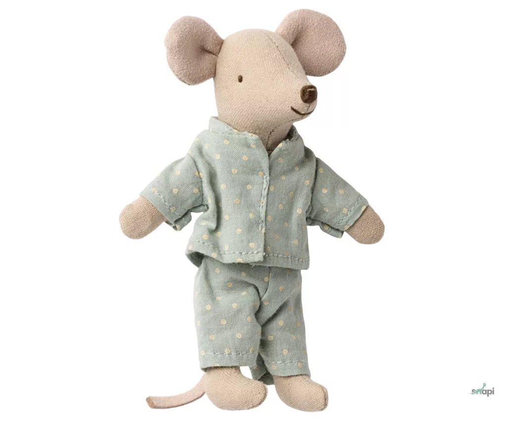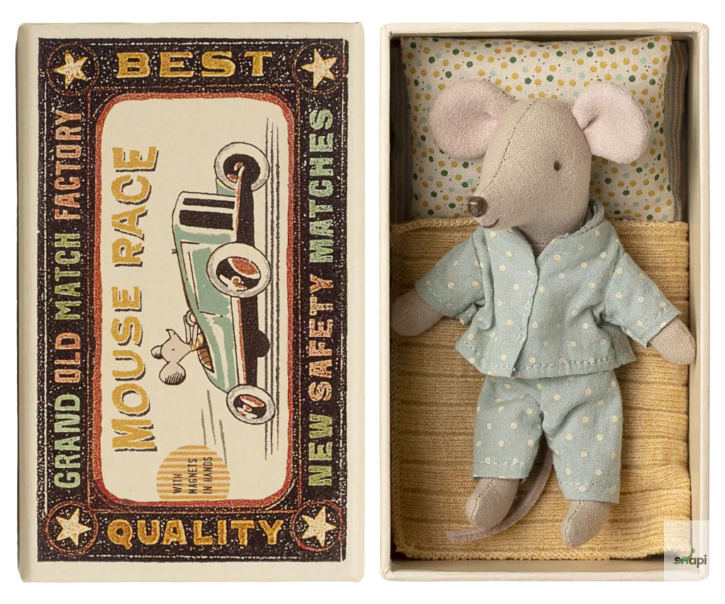 Egy klasszikus Maileg termék, ez az egér órákig tartó játékra kész, és nyugodtan alszik a kis gyufásdobozában. A ruhák és az ágynemű puha anyagokból készültek, egyedi mintákkal gyönyörű színekben. Az egér kezében mágnesek vannak.