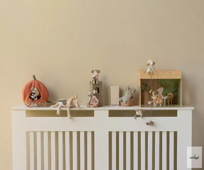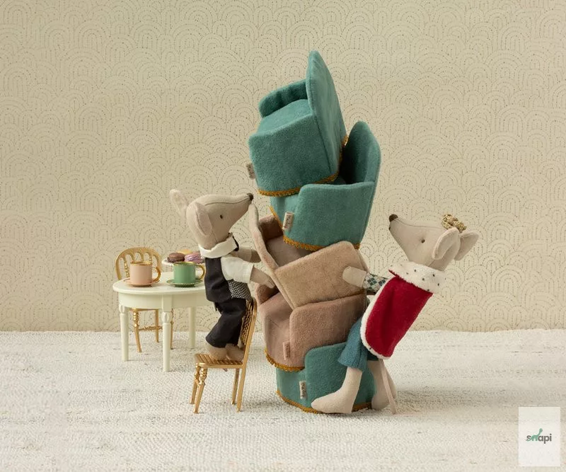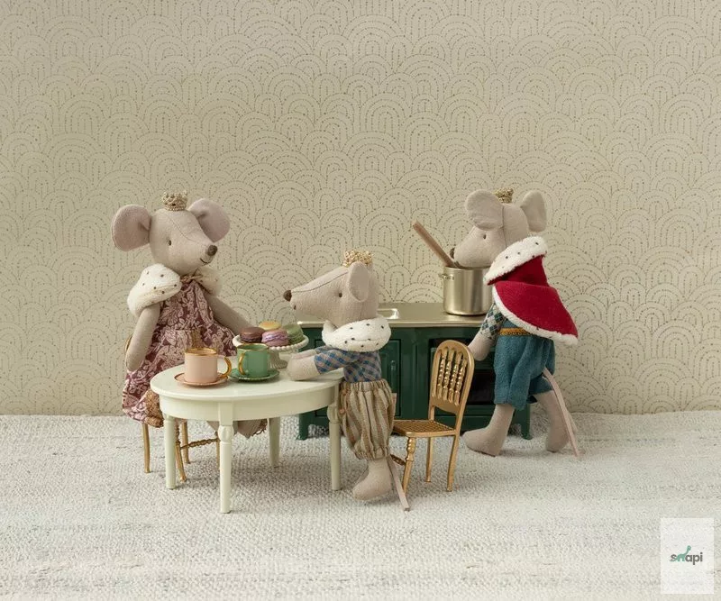 Az Apa méretű Királyegér készen áll, hogy házigazda legyen a kastélyában. Köpenyt és koronát visel, és tökéletesen illik a várcsarnokba.