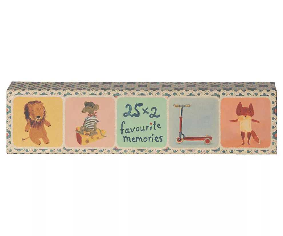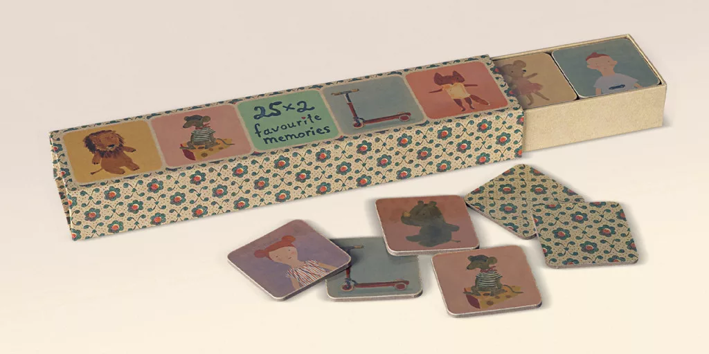 Klasszikus memóriajáték 25 különböző illusztrációval, amelyet Dorthe Mailil rajzolt. Az ihletet az évek során előállított különféle tárgyakból merítik. A játék 50 kártyát (25 párt) tartalmaz.