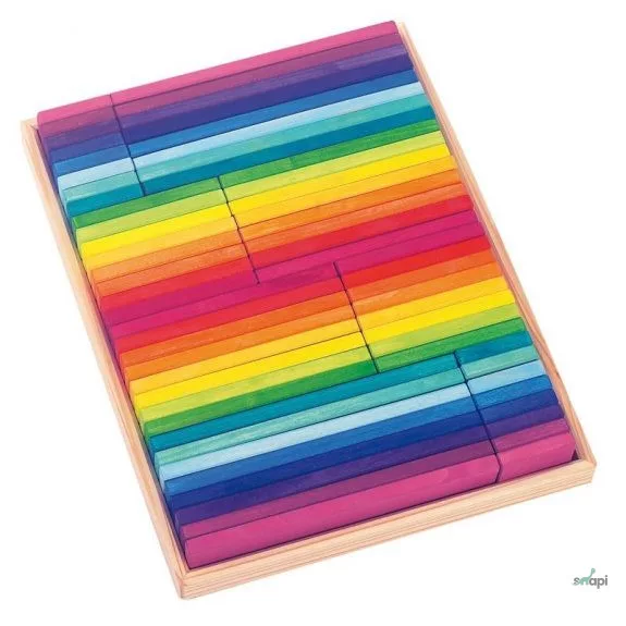 Setul „Curcubeu” conține 64 de plăci frumos colorate în culorile curcubeului, de diferite lungimi, din lemn de tei.