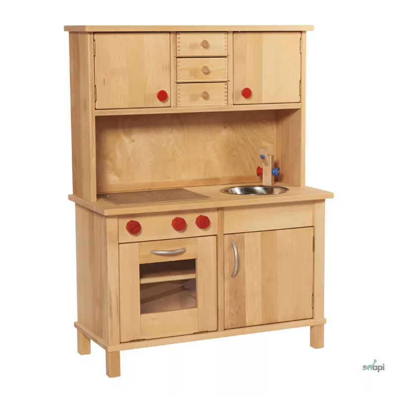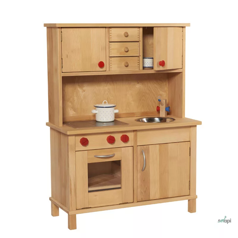 Un aspect special al bucătăriei este că poate fi așezată la perete, economisind spațiu, dar oferind totodată mult loc pentru joacă. Pe lângă dulapurile superioare, conține trei sertare din lemn frumos lucrate, cu îmbinare tip coadă de rândunică. Acest lucru permite depozitarea tuturor accesoriilor și ustensilelor de bucătărie în dulapul superior. Dedesubt se află o plită ceramică din lemn, un cuptor cu tavă de copt din lemn, un frigider și o chiuvetă din oțel inoxidabil cu robinet din lemn. Există și o mică bară cu butoane roșii din lemn pentru agățat prosoape sau ustensile de bucătărie.
