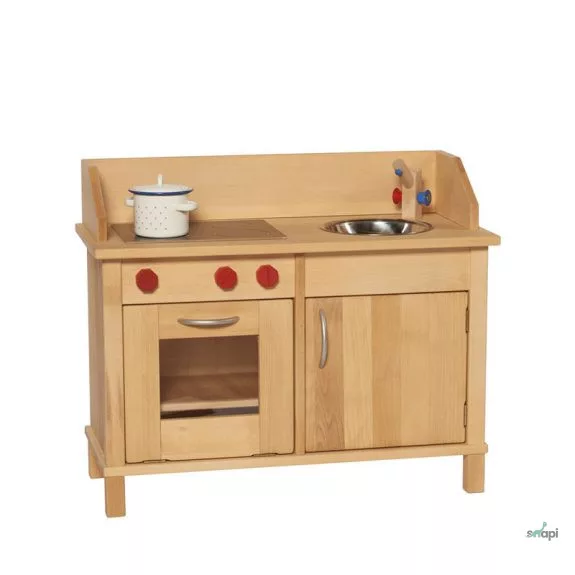 Un aspect special al bucătăriei este că poate fi așezată la perete, economisind spațiu, dar oferind totodată mult loc pentru joacă. Bucătăria include o plită ceramică din lemn, un cuptor cu tavă de copt din lemn, un frigider și o chiuvetă din oțel inoxidabil cu robinet din lemn. Un raft înconjoară bucătăria, încadrând armonios zona de gătit și spălat. Spațiul de depozitare lipsă poate fi creat, de exemplu, prin plasarea unui suport de joacă lângă bucătărie sau montarea unei polițe sau a unui dulap superior deasupra. Libertatea de design și creativitatea nu au limite aici.